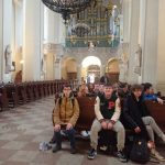 Następnie udaliśmy się do dzielnicy Antokol, zamieszkałej niegdyś przez rody magnackie, w tym przez Radziwiłłów. Zobaczyliśmy dworek, w którym mieszkała Emilia Plater ( vide “Śmierć Pułkownika”). Dziś znajdują się tam liczne ambasady. Tam też zwiedziliśmy jedną z dziesięciu najpiękniejszych świątyń Europy – Kościół św. Piotra i Pawła. Barokowa świątynia urzeka swoim wnętrzem: rzeźbami nawiązującymi do mitologii i Biblii, obrazami oraz kryształowym żyrandolem w kształcie statku. Na Antokolu znajduje się też domek św. Faustyny, w którym mieszkała przez cztery miesiące. To Wilnie powstał pierwszy obraz Bożego Miłosierdzia.